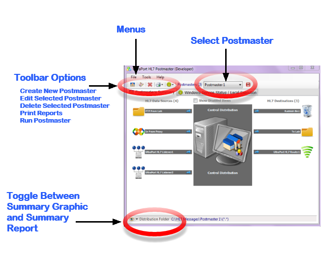 Also, while you can create as many different postmasters as you like, if you own a Developer License or if you are only evaluating the product with a Demo / Evaluation License you can only actually "Run" one HL7 Postmaster at a time (see Running Postmasters). With the Professional License when you run the UltraPort HL7 Postmaster MS Windows Services ALL of your enabled postmasters will be "Run" simultaneously. |