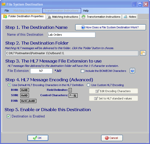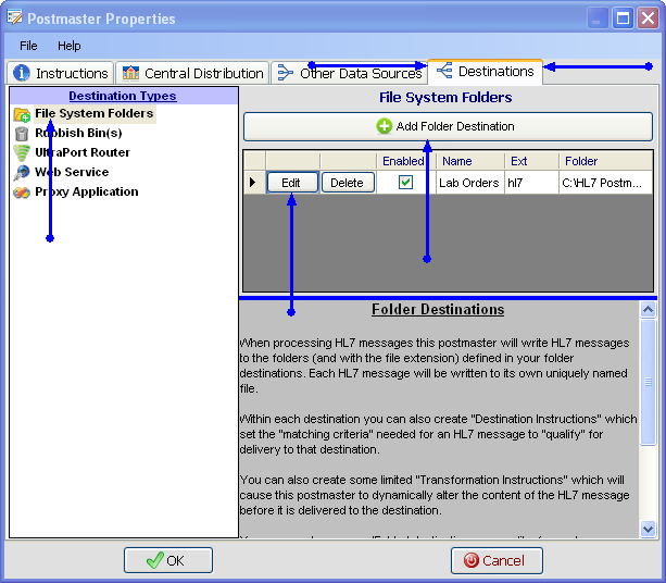 File System Folders. The most common type of destination is simply a folder on the MS Windows file system wherein HL7 messages are delivered from Central Distribution to a destination folder (selectively if you use matching instructions) on the file system with a particular file extension selected by the user (you).
