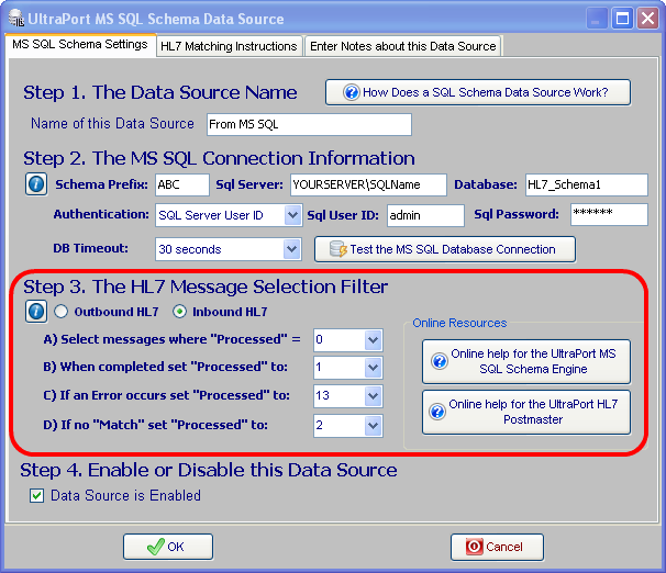 Second. Values A, B, C, and D deal with a column in the main data table named Processed (SQL Type Numeric, Not Null). This Processed column is used by both the UltraPort MS SQL Schema Engine and other interfacing processes (like the HL7 Postmaster or your own custom applications). Example: When an HL7 message is imported into the database by the SQL Schema Engine the Processed field is set to 0. Typically a third party process would then poll the main table looking for HL7 messages where the Processed field is 0, then extract data from any records that query returned, and after doing that set the Processed field for each record to 1 (or any non-zero value).