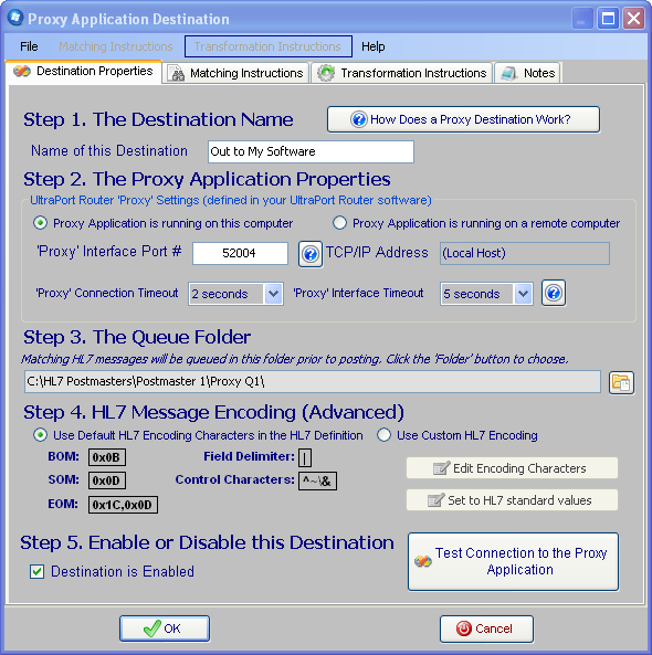 Step 3. The Queue Folder. Even if the Proxy Application at the other end of your destination is not running, the Postmaster will continue to deliver HL7 messages to it by "Queuing" up the messages in the Queue folder until the Proxy Application comes back online. Click the button to browse for the folder which the postmaster should use for this.