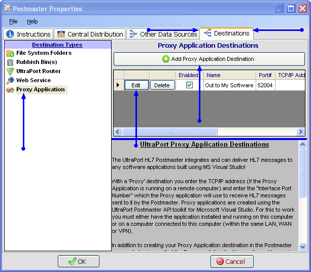 With a 'Proxy' destination you enter the TCP/IP address (if the Proxy Application is running on a remote computer) and enter the "Interface Port Number" which the Proxy application will use to receive HL7 messages sent to it by the Postmaster. Proxy applications are created using the UltraPort Postmaster API toolkit for Microsoft Visual Studio (see Proxy Application Development for more information). For this to work you must either have the application installed and running on this computer or on a computer connected to this computer (within the same LAN, WAN or VPN).