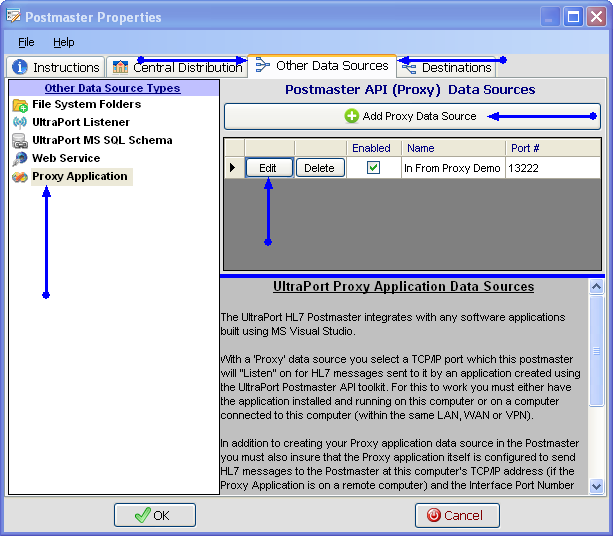 In addition to creating your Proxy application data source in the Postmaster you must also insure that the Proxy application itself is configured to send HL7 messages to the Postmaster at this computer's TCP/IP address (if the Proxy Application is on a remote computer) and the Interface Port Number you enter in the Postmaster Proxy application profile.