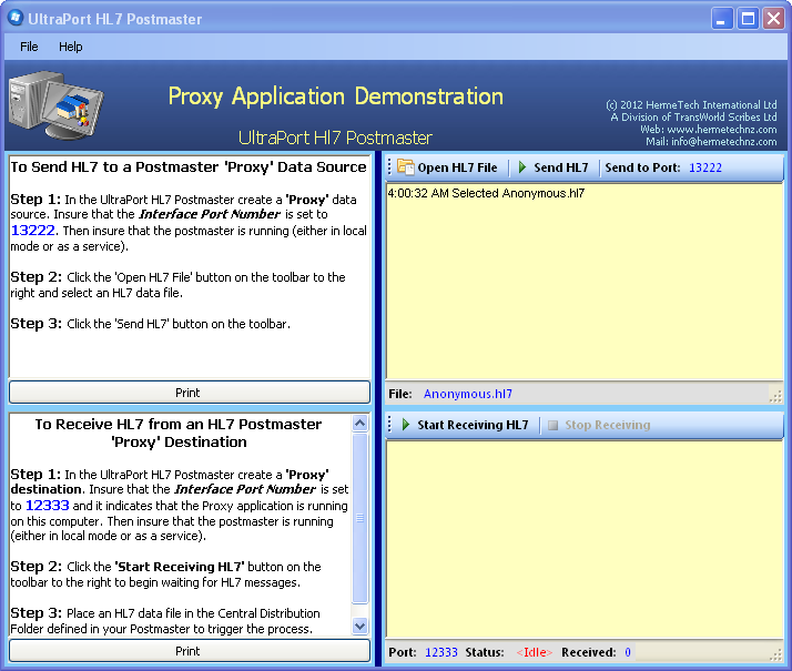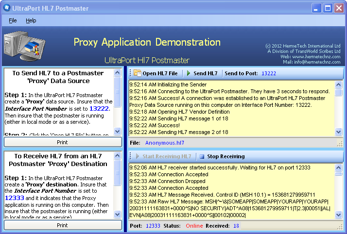 The UltraPort HL7 Postmaster software comes with a simple application which demonstrates how a Proxy application works. It demonstrates both how to use a Proxy application to SEND HL7 messages to an HL7 Postmaster "Proxy" Data Source as well as how to RECEIVE HL7 messages from an HL7 Postmaster "Proxy" Destination.