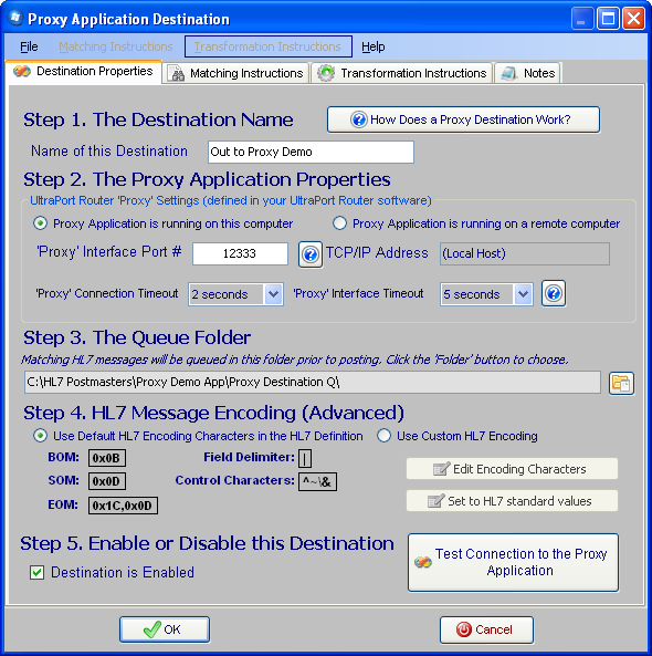 Step 3. In the Proxy Demo postmaster create a Proxy Destination (see Proxy Destinations) named Out to Proxy Demo. Make sure that in the destination properties the Interface Port Number field is set to 12333. and the checkbox is checked that indicates that the Proxy Application is running on this computer. Use a new unused folder as the Queue Folder. No Matching Instructions or Transformation Instructions are necessary. When completed the Data Source properties should look something like the screen-shot below: