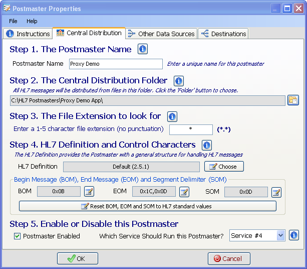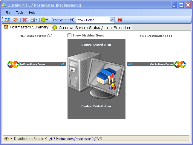 Step 1. In the UltraPort HL7 Postmaster create a new Postmaster named Proxy Demo using a new unused folder as the Central Distribution Folder. When completed the Central Distribution tab should look something like the screen-shot below: