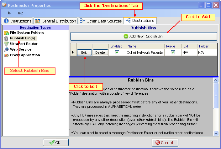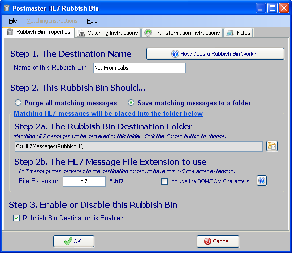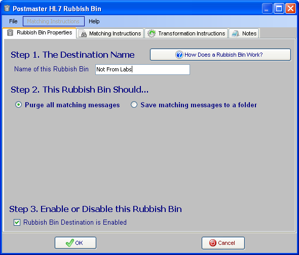 •When you create a Rubbish Bin it MUST have Matching Instructions. With other types of Postmaster destinations Matching Instructions are optional. Since a Rubbish Bin, by design, is meant to "eat" HL7 messages and prevent them from being delivered to other destinations Matching Instructions are required.