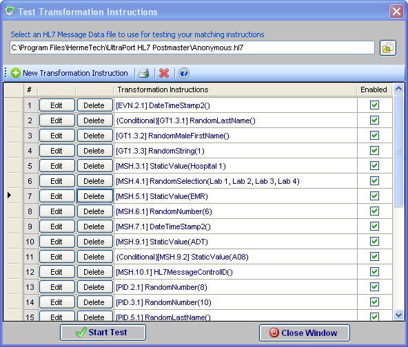 Click the button on the Transformation Script Toolbar to test your Transformation Instructions using an HL7 data file. It will open up the testing window.