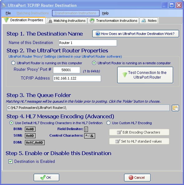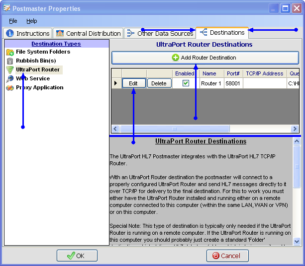 The UltraPort HL7 TCP/IP Router is an HL7 "sender". It transmits HL7 messages over TCP/IP to any HL7 standard TCP/IP "listener" application. In a nutshell, the UltraPort Router monitors a file system folder (selected by you) for HL7 message data files and when detected, it extracts all HL7 messages and transmits them to an HL7 standard Listener (receiver). We explain this here because, while it might seem counter-intuitive, you should only NEED to create this type of destination IF the UltraPort HL7 Router is actually RUNNING on a DIFFERENT computer/server than the UltraPort HL7 Postmaster. If the UltraPort Router is running on the same computer/server then a better option is to just create a File System Folder Destination and then configure the UltraPort Router to monitor that folder.