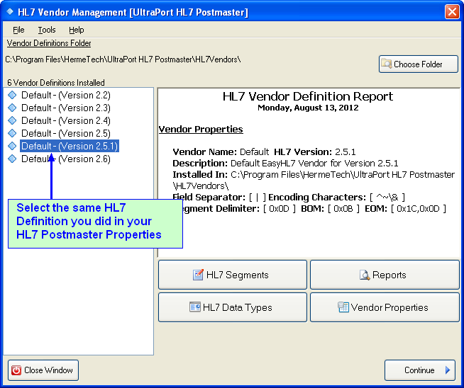 Step 1. Open the HL7 Vendor Management window from the Tools menu of the main window and select the Version definition you are using in your postmaster.