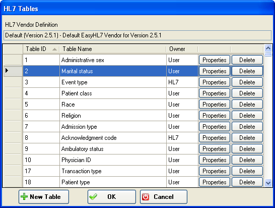Step 2. In the Tools menu of the Vendor Management window select View / Edit HL7 Internal Tables. This will open up the HL7 Tables window. Either scroll to and select the table you wish to edit and click the Properties button or click the New Table button to create a new internal table.