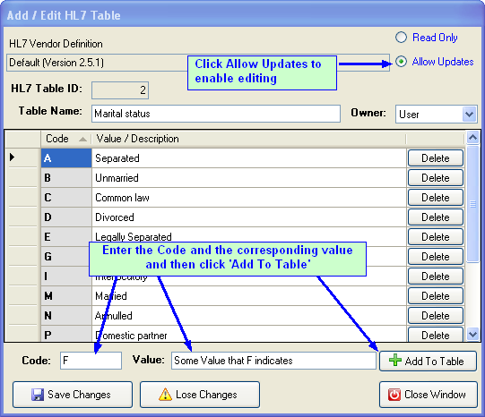 Step 3. Your actions in Step 2 open up the Add / Edit HL7 Table details window. Add or edit values as needed and click 'Save Changes' when completed.